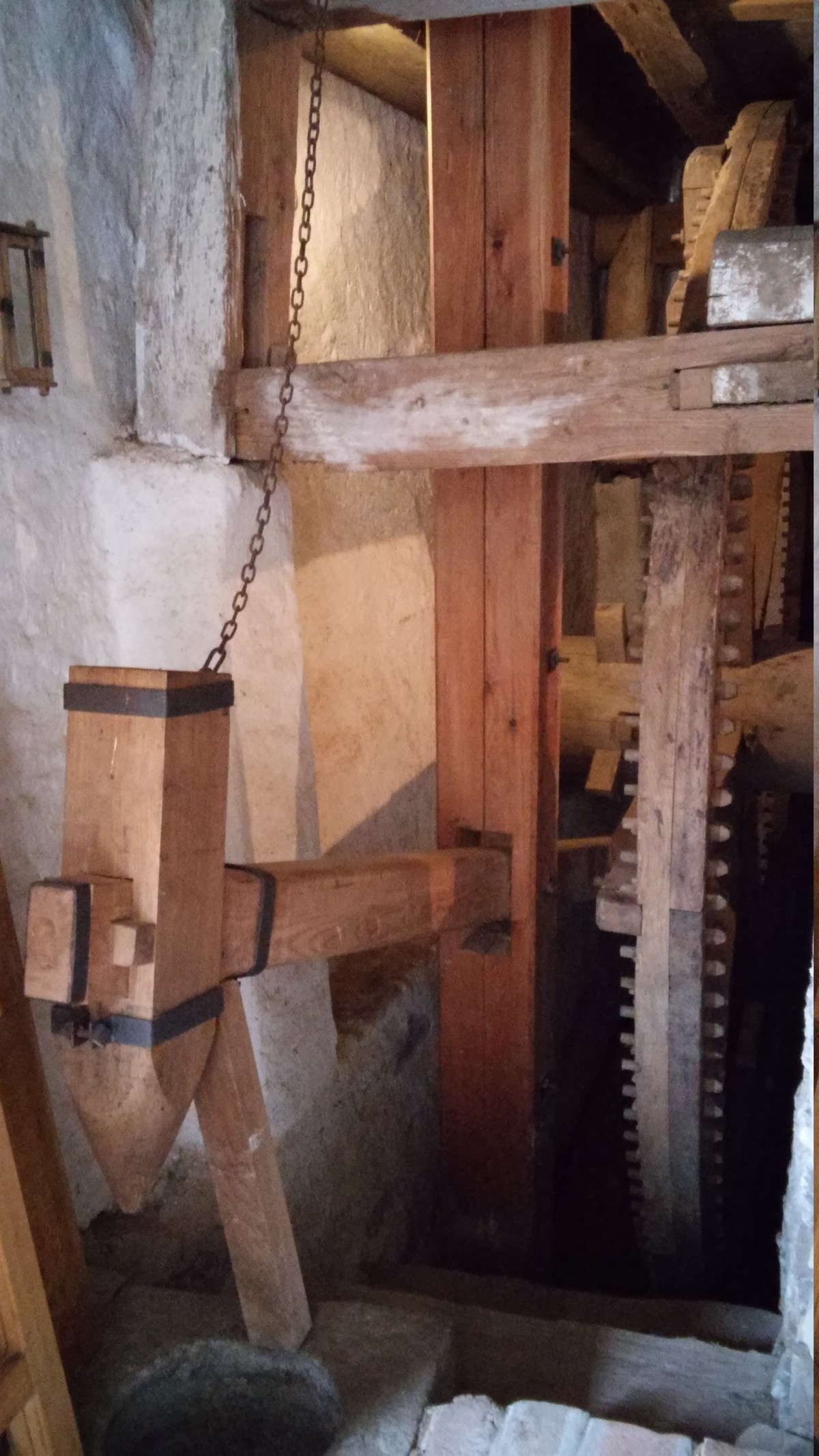 Der einzige Mahlgang der Mühle: Oben der Aufschütttrichter, darunter der Rüttelschuh, zuunterst Läufer und Bodenstein