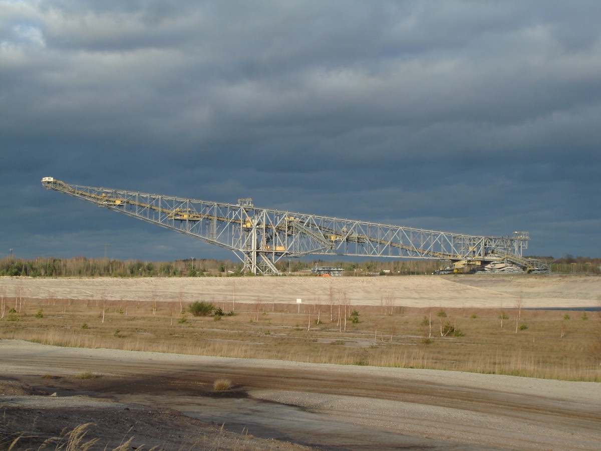Bei diesen Abraumförderbrücken vom Typ F60 handelt sich um die größten Maschinen, die jemals hergestellt wurden – und zwar in der DDR im Lauchhammerwerk. Selbst die größten Supertanker auf den Weltmeeren reichen in ihren Dimensionen bei weitem nicht an die der F60 heran. Zum Vergleich: Der kleine weiße Kasten an der Spitze links oben im Bild ist eine Aussichtskanzel von der Größe eines kleinen Hauses für die Besucher des Besucherbergwerks und befindet sich in etwa 100 m Höhe. Von den sechs erbauten Exemplaren dieses Typs sind fünf weitere noch im Einsatz. Bilder von einer der Schwestern dieses Giganten im aktiven Tagebau Welzow-Süd finden sich in diesem Beitrag.