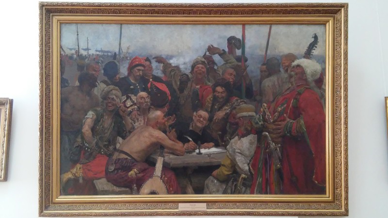 Ein sehr berühmtes Gemälde des großen – in meinen Augen unerreichten – Meisters Илья Ефимович Репин (Ilja Jefimovič Repin) ist „Die Saporoger Kosaken schreiben dem türkischen Sultan einen Brief“, dessen bekannteste Version in der Tretjakov-Galerie in Moskau zu sehen ist. Daher kannte ich dies Gemälde auch bereits. Hier in Charkov ist neben etlichen anderen Werken des Meisters eine weitere (frühere?) Version dieses Gemäldes zu sehen. Man vergleiche mit der laut Wikipedia von 1891 stammenden Version in der Tretjakov-Galerie. Dieser Brief dürfte für den türkischen Sultan nicht gerade ein Anlaß zur Freude gewesen sein :)