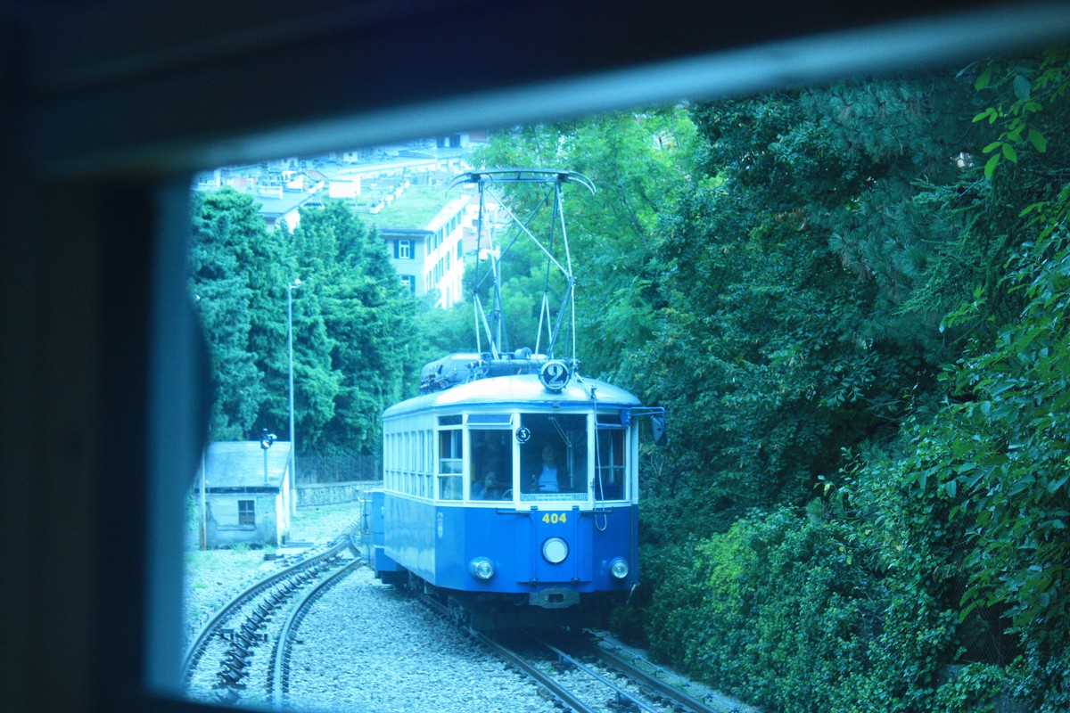 Nun geht es mit sechsundzwanzig Prozent Steigung als Standseilbahn bis nach Vetta Scorcola, wo der Seilbahntraktor wieder sacht entschwindet, und im Adhäsionsbetrieb weiter bis zur Bergstation Villa Opicina.