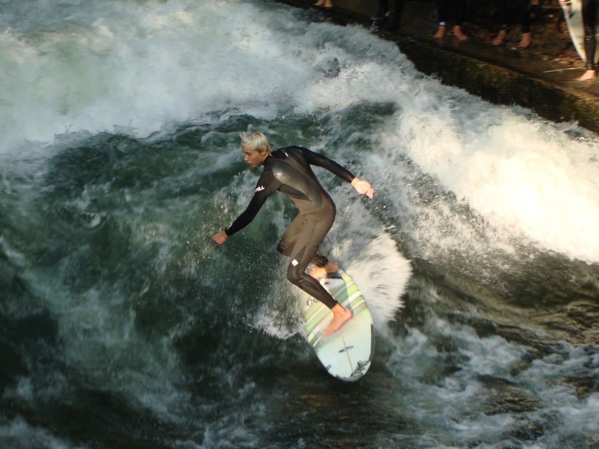 Am 23.09.2009 ließen wir nach einem wunderschönen Aufenthalt in Omiš an der dalmatinischen Adriaküste den Urlaub in meiner alten Heimat München ausklingen. Dazu gehörte auf Wunsch meiner Frau auch ein Besuch im Englischen Garten, und zwar besonders zur sogenannten „Eisbachwelle“ an der Eisbachbrücke in der Nähe des Hauses der Kunst. Der Eisbach gehört zum System der Münchner Stadtbäche, welche aus der Isar und dem Isar-Werkkanal ausgeleitet werden und auch wieder in die Isar münden. In früheren Zeiten hatten diese Stadtbäche große wirtschaftliche Bedeutung. Eine Vielzahl an Mühlen wurde einst durch sie angetrieben; noch bis in die allerjüngste Zeit arbeitete die letzte „handwerkliche“ Getreidemühle Münchens, die Kraemer'sche Kunstmühle, mit der Wasserkraft des Auer Mühlbachs.