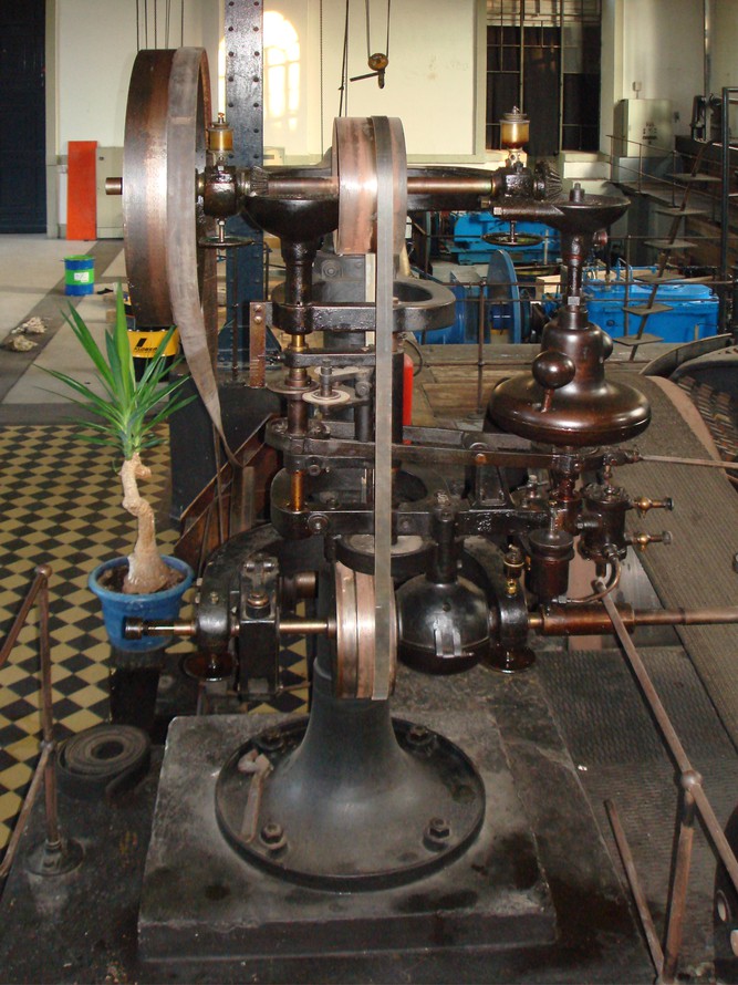 Was uns dort in der zeittypisch großzügig angelegten Kraftwerkshalle erwartete, war für den Freund der Wasserkraft geradezu überwältigend. Zwei Voith-Getriebemaschinensätze aus den 1980er Jahren arbeiten fleißig ... und dann ist da noch einer der alten Maschinensätze vom Baujahr 1901. Eines jener großen eisernen Kammräder mit hölzernen Zähnen, das für Kleinwasserkraftanlagen dieser Zeit typisch ist, sitzt auf der Welle der liegenden Francisturbine und treibt eine Riemenscheibe mit horizontaler Welle. Diese wiederum über Transmission den Generator. Geregelt wurde das über einen Watt'schen Fliehkraftregler wie bei manchen Dampfmaschinen – siehe Bild links.